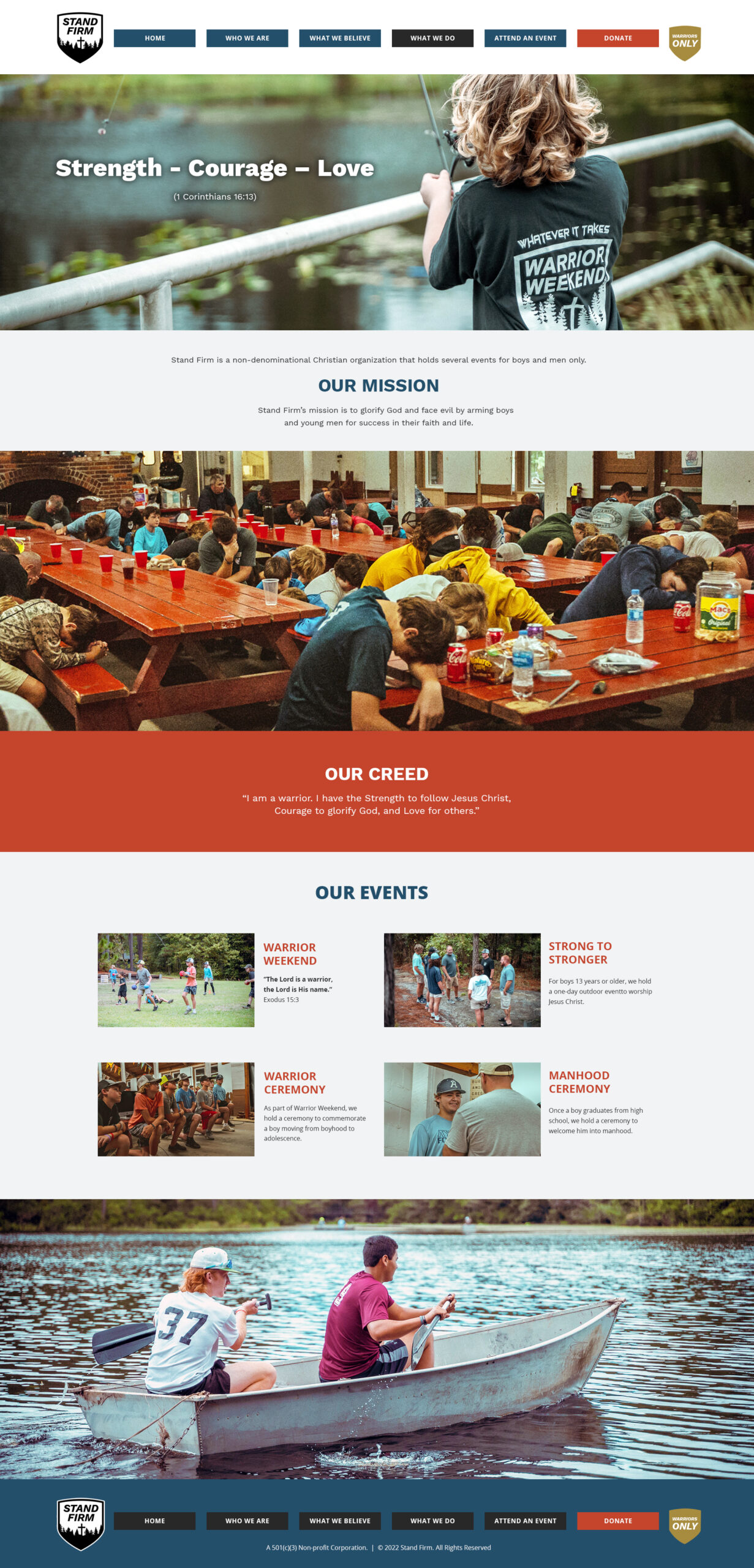 Custom Design: We adapted the existing Warrior Weekend logo to create a custom Stand Firm logo, keeping the branding cohesive. A masculine color palette was developed to reflect the organization’s tone and mission.